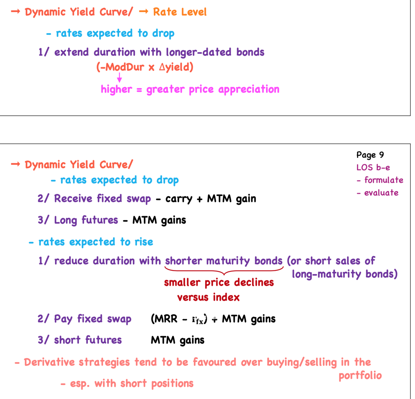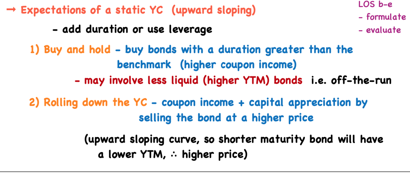 Dynamic yield curve: What are the strategies if rates expected to drop vs rates expected to rise? Would you favour derivates vs over/under selling bonds and why?