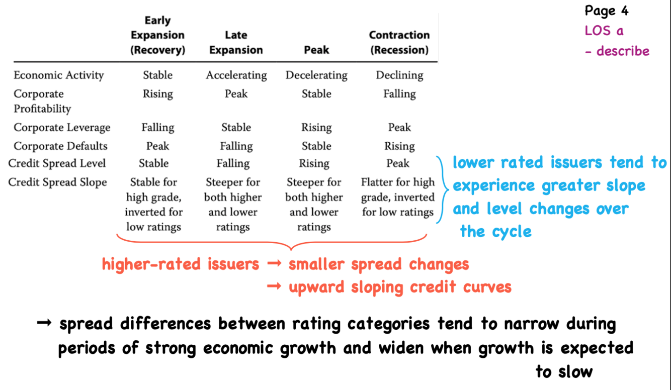 What is happening to Economic activity, profitability, leverage, defaults, spread level, spread slope over the credit cycle (early expansion, lat exp, peak, contraction)?