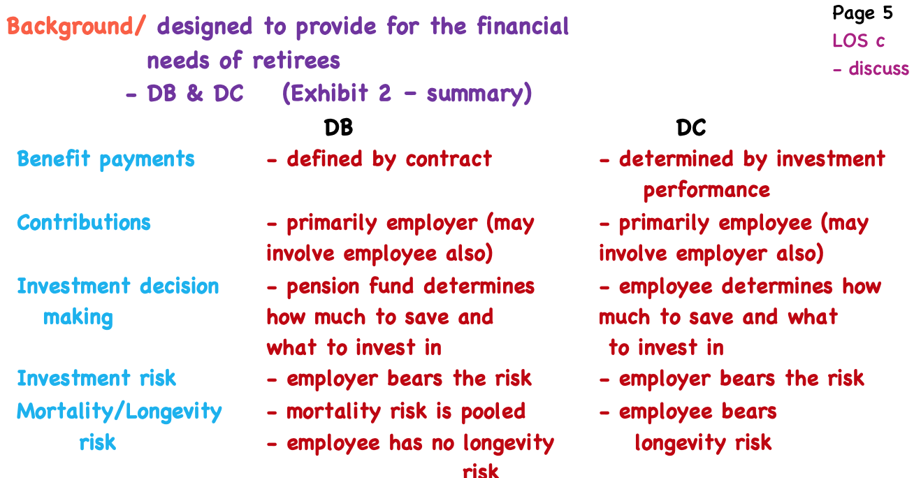 Pension funds: what is the benefit payments, contributions, investment decision making, investment/longevity risk for DC and DB ?