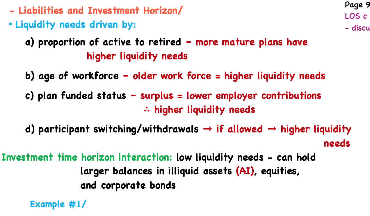 What are the liquidity needs for pensions driven by and how does this influence investment horizon?
