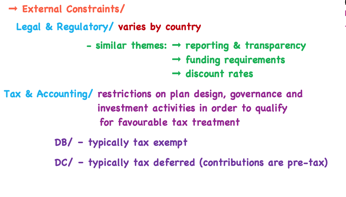 What are the legal and regulatory constraints for pensions and what are the tax & accounting effects?