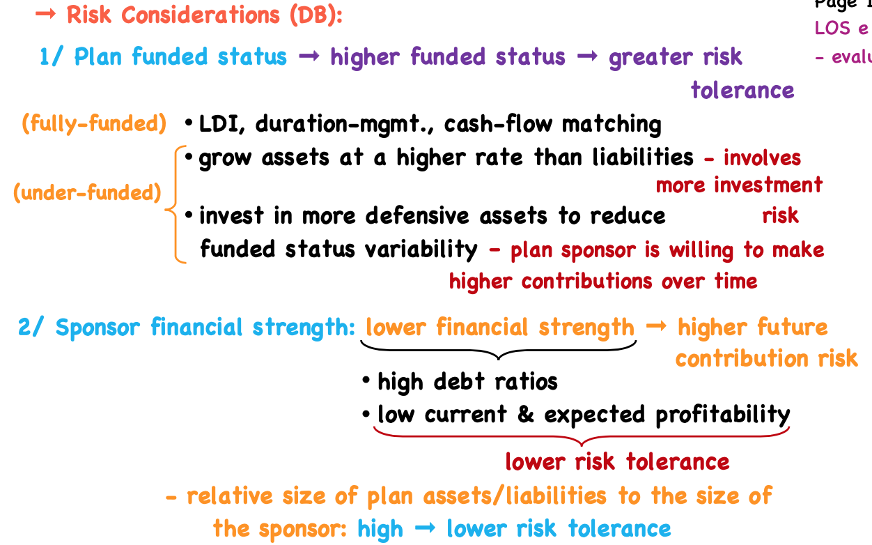 Risk considerations (DB): How does planned funded status impact risk tolerance - under vs over funded? How does sponsor financial strength impact risk tolerance?