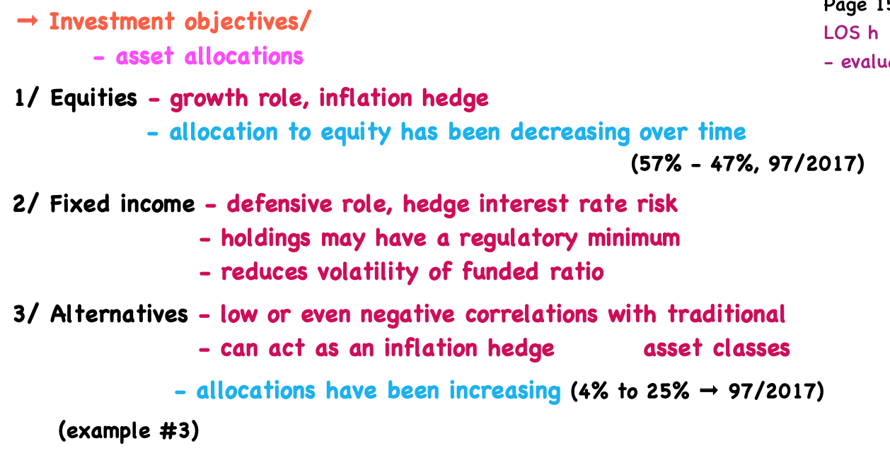 Explain the role of equities, FI and AI in pension portfolios and how the allocation has changed historically?