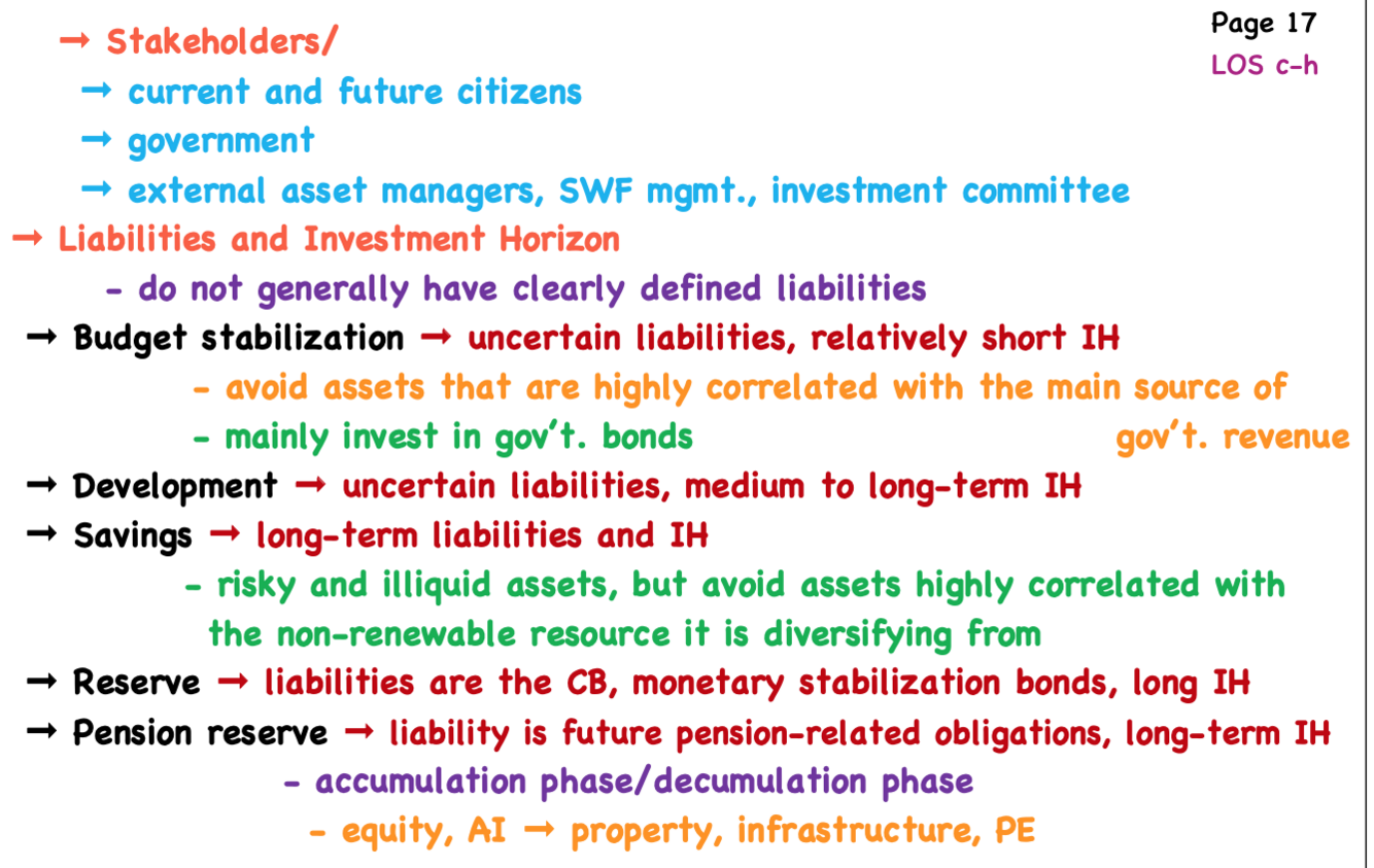 Who are the stakeholders for SWF’s and how does the liability and IH differ by SWF type?