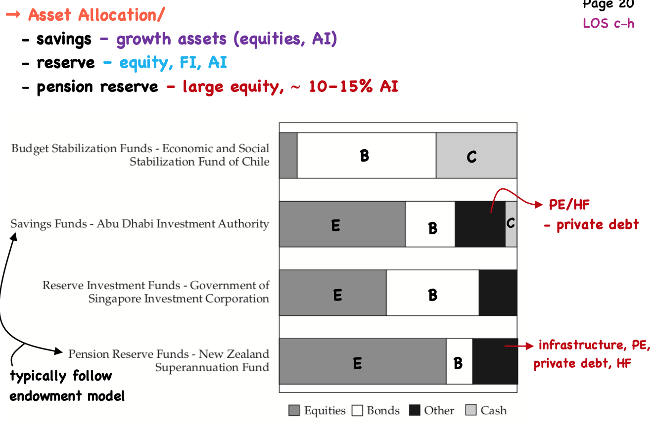 What is the usual asset allocation for equity, bonds, other and cash for each SWF type?