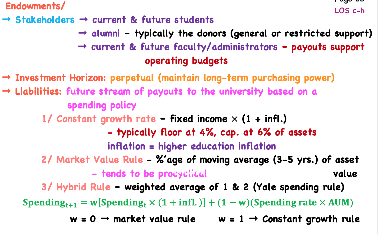Endowments: who are the stakeholders, what is the investment horizon and the liability? What are the three methods for spending policy?