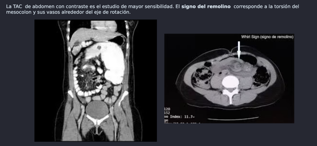 TAC abdominopélvica con contraste: “signo del remolino”, torsión de mesenterio