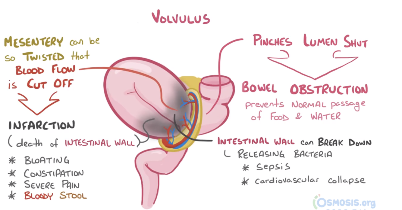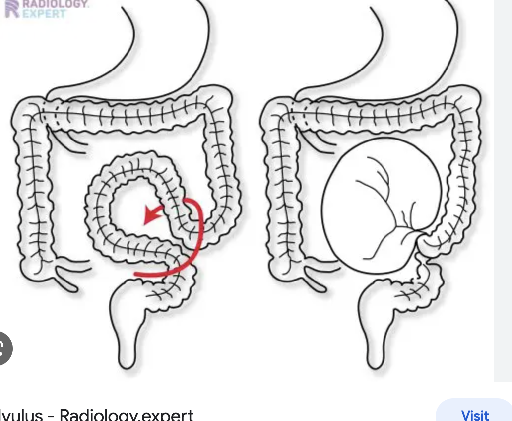4 - increased abdominal adhesions that act as a pivot point for bowels to twist