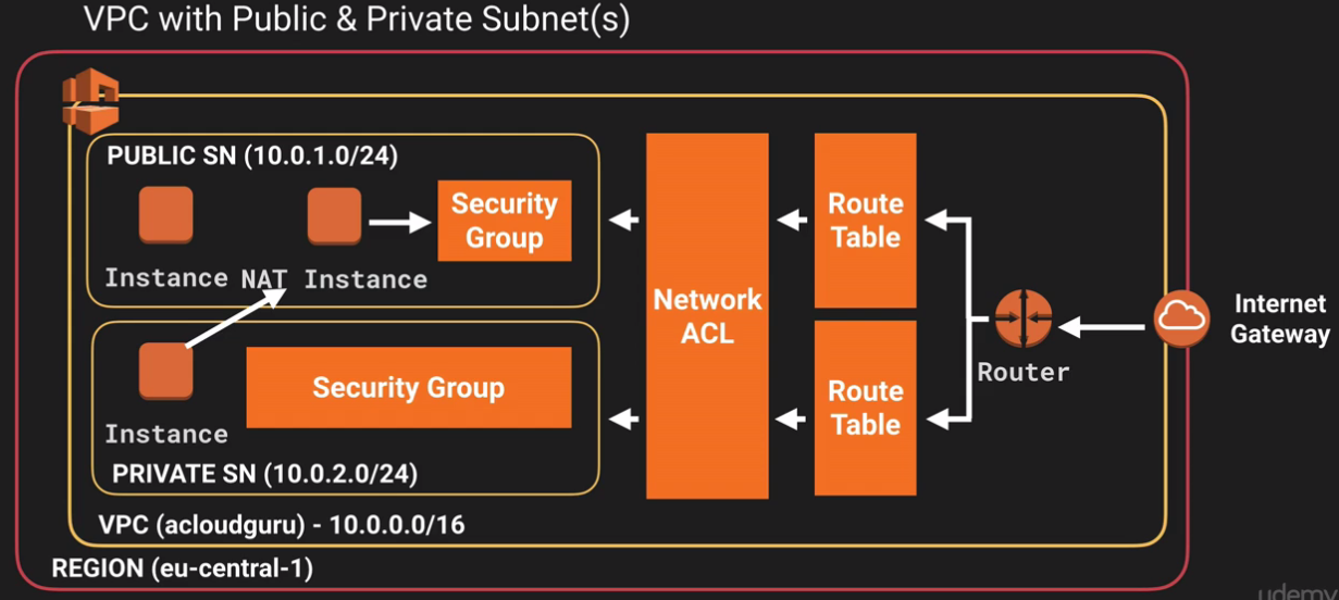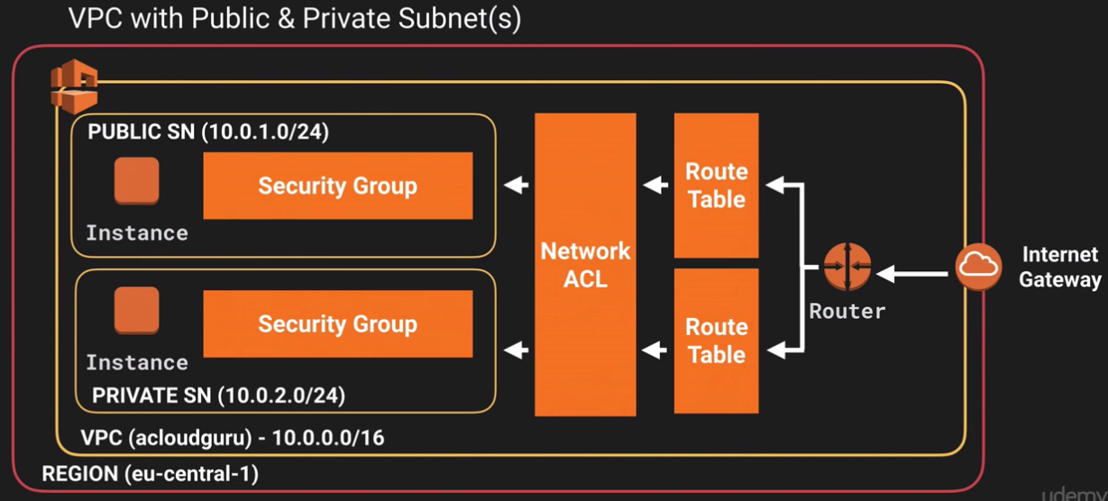 Security Group Network ACL Operates at the instance level (first layer of defense) Operates at the subnet level (second layer of defense) Supports allow rules only Supports allow rules and deny rules Is stateful: Return traffic is automatically allowed, regardless of any rules Is stateless: Return traffic must be explicitly allowed by rules We evaluate all rules before deciding whether to allow traffic We process rules in number order when deciding whether to allow traffic Applies to an instance only if someone specifies the security group when launching the instance, or associates the security group with the instance later on Automatically applies to all instances in the subnets it’s associated with (backup layer of defense, so you don’t have to rely on someone specifying the security group)