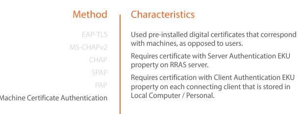 Uses pre-installed certificates that correspond with machines as opposed to users