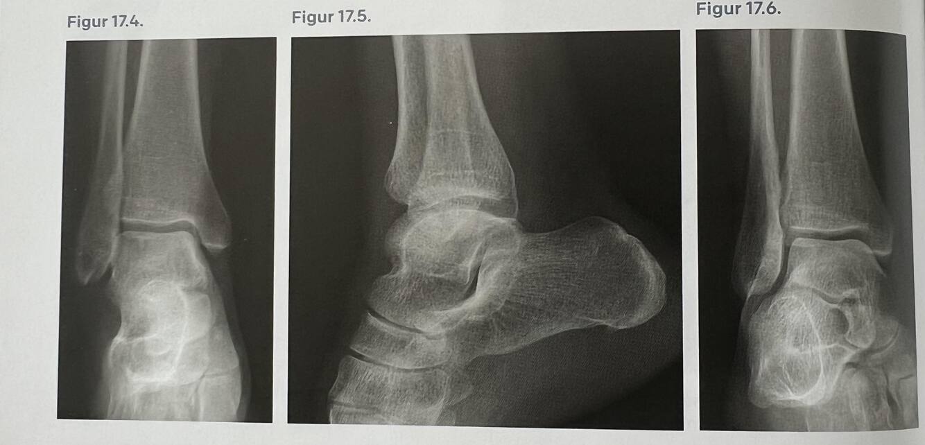 Du finder palpationsømhed sv.t. det anteriore talofibulare ligament. Behandlersygeplejersken har dog sendt patienten til røntgen og du får disse billeder.