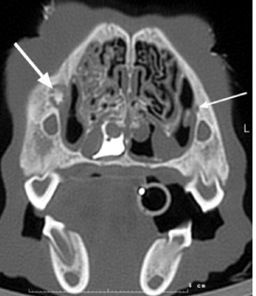 1-3ml of iodinated contrast injected in dorsal or ventral nasal puncta in a dog