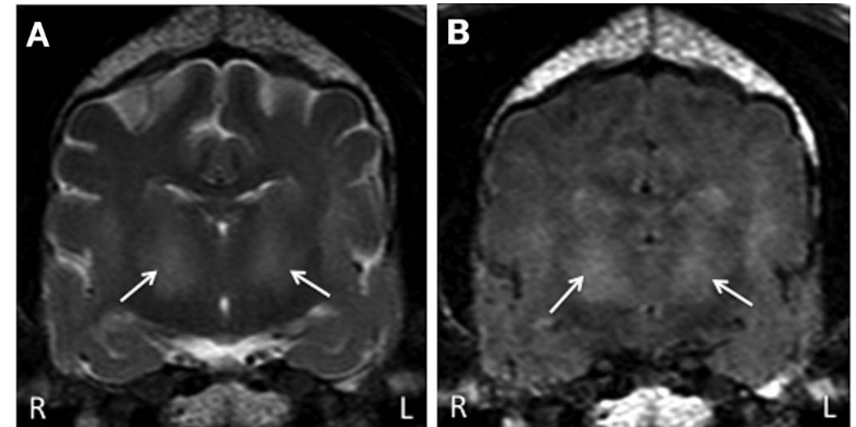 Neuronophagia and gliosis of the gray matter of the affected regions seen in 3T MRI.