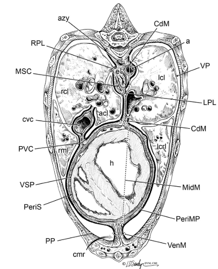 Extension of the omental bursa into the dorsal caudal mediastinum but separated by diaphragm.