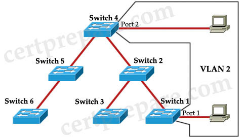 Refer to the exhibit. VTP has been enabled on the trunk links between all switches within the Certprepare domain. An administrator has recently enabled VTP pruning. Port 1 on Switch 1 and port 2 on Switch 4 are assigned to VLAN 2. A broadcast is sent from the host connected to Switch 1. Where will the broadcast propagate?