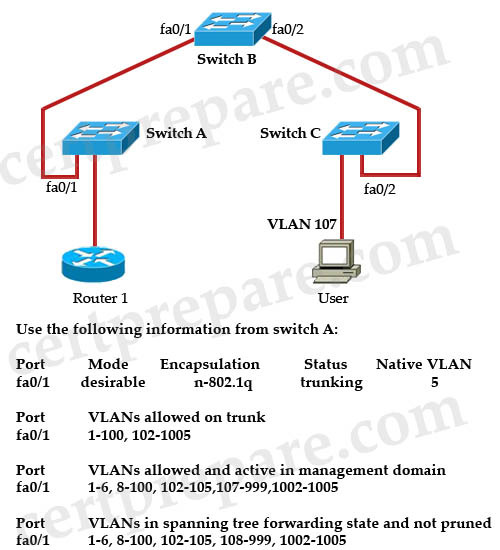 From the “VLANs in spanning tree forwarding state and not pruned” we can deduce that VLAN 107 is currently pruned on switch A.