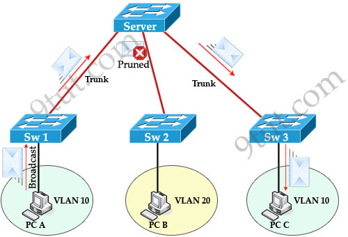 When PC A sends a broadcast frame on VLAN 10, it travels across all trunk links in the VTP domain. Switches Server, Sw2, and Sw3 all receive broadcast frames from PC A. But only Sw3 has user on VLAN 10 and it is a waste of bandwidth on Sw2. Moreover, that broadcast traffic also consumes processor time on Sw2. The link between switches Server and Sw2 does not carry any VLAN 10 traffic so it can be “pruned”.