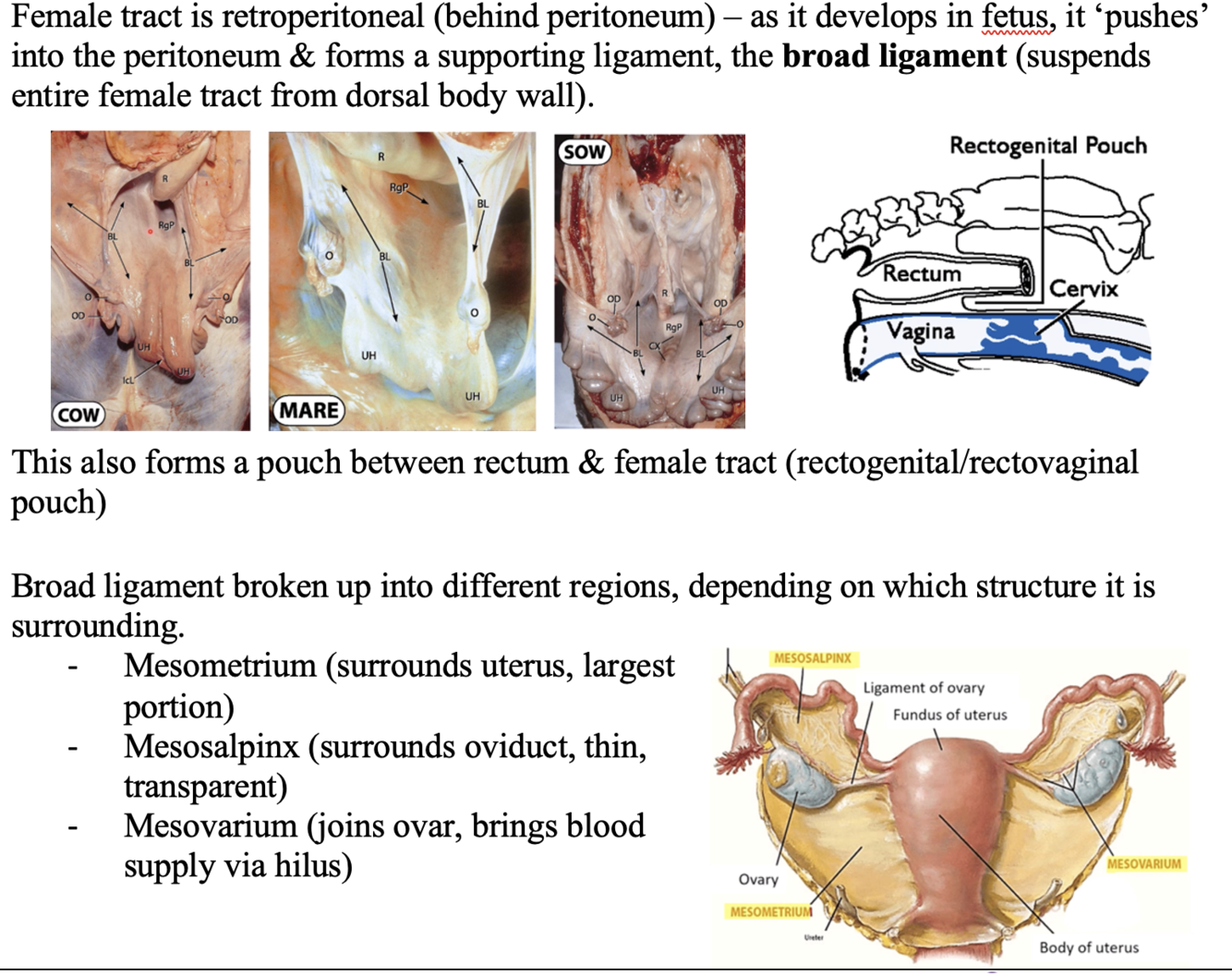Female tract is retroperitoneal (behind peritoneum) – as it develops in fetus, it ‘pushes’ into the peritoneum & forms a supporting ligament, the broad ligament (suspends entire female tract from dorsal body wall).