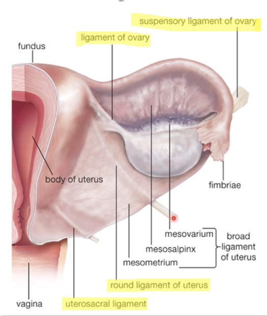 - Ovarian ligament (proper ligament of ovary) ties ovary to uterus for support