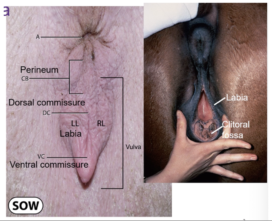 Consists of vulva, which consists of 2 labia (major & minor) which meet at dorsal and ventral commissures