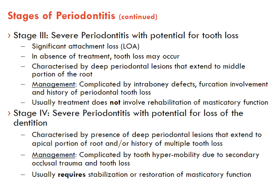 tooth loss (if more than 5, and breakdown of dentition/occlusion= stage 4)