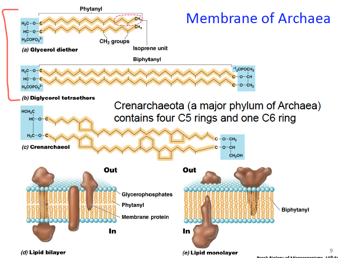 constructed from either phosphoglycerol diethers, which have C20 side chains (called a phytanyl group) or diphosphoglycerol tetraethers (C40 side chains, called a biphytanyl group)