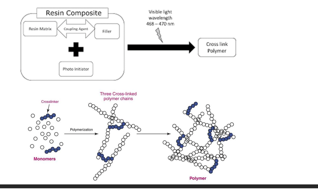 Using light (420-480nm) to initiate and propagate a polymerization reaction to form a crosslinked polymer structure.