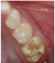 Discolouration of biofilm, very common. Due to suboptimal OH care, must differentiate that the ‘yellowish’ the pt is referring to is not the cementum/dentine of exposed roots etc