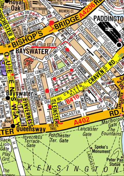 Departure details: Via Bayswater road or Leinster Terrace F Leinster Gardens or R Craven hill gardens, F Craven road