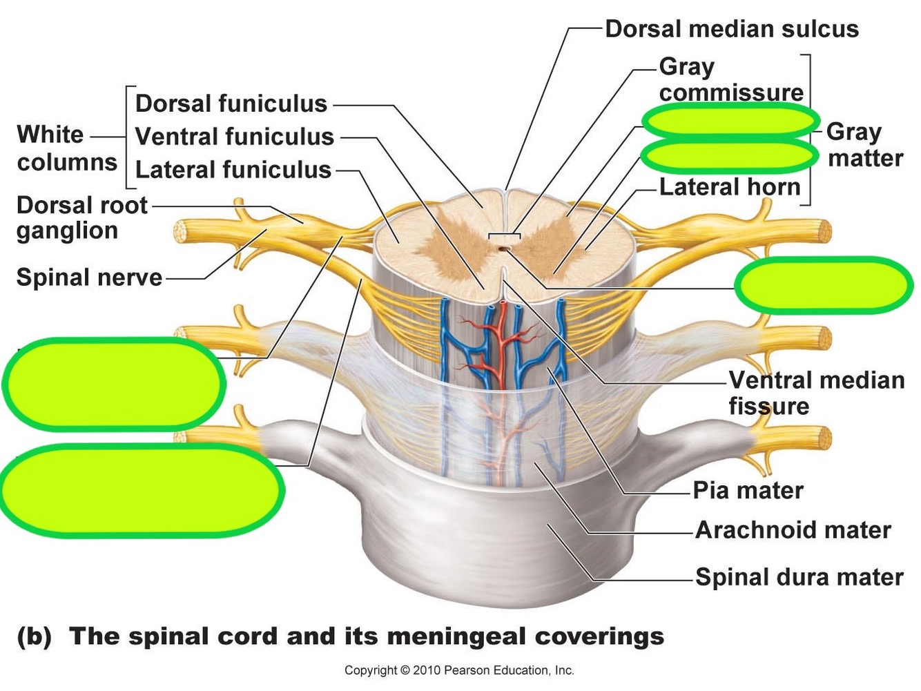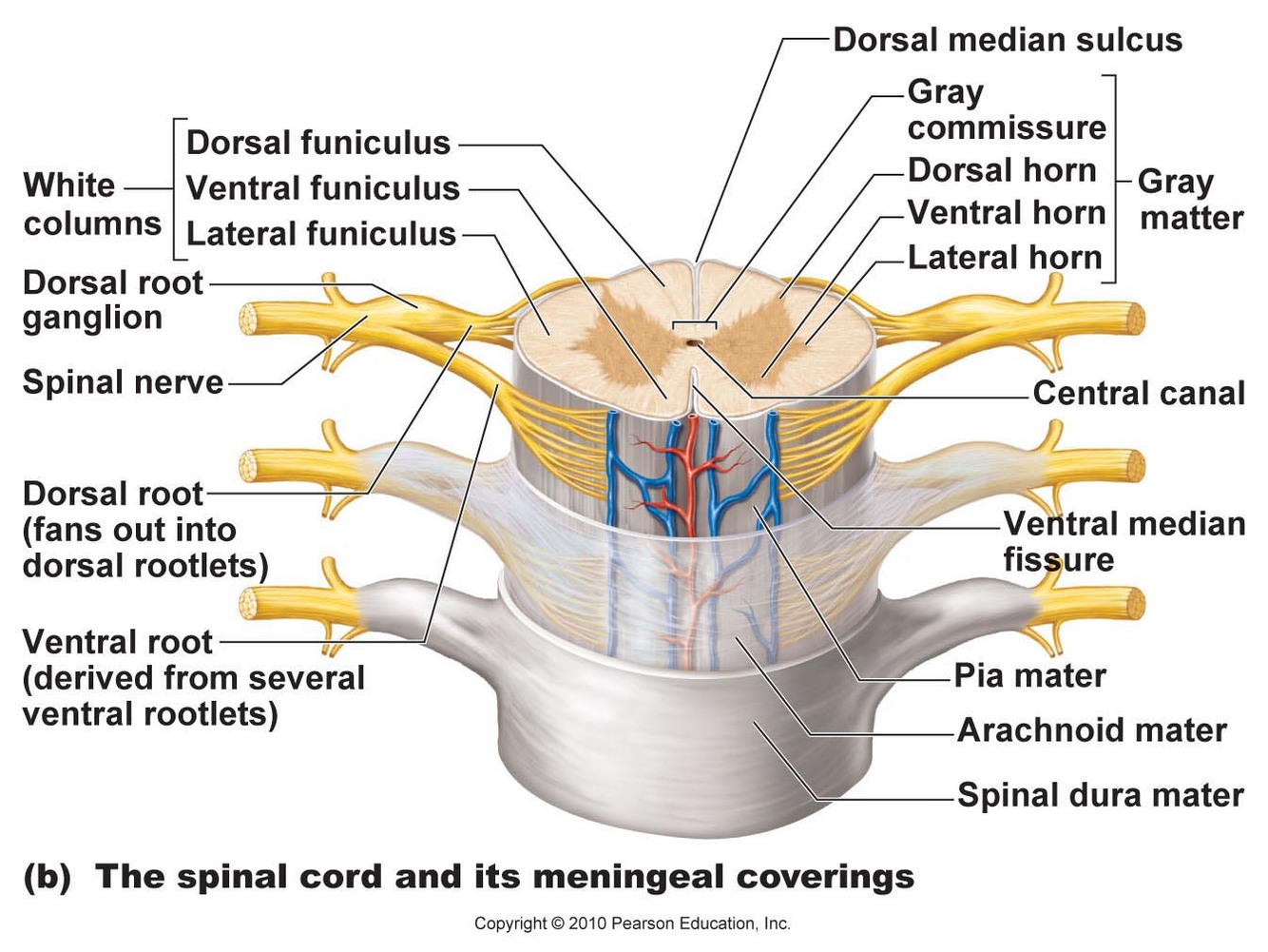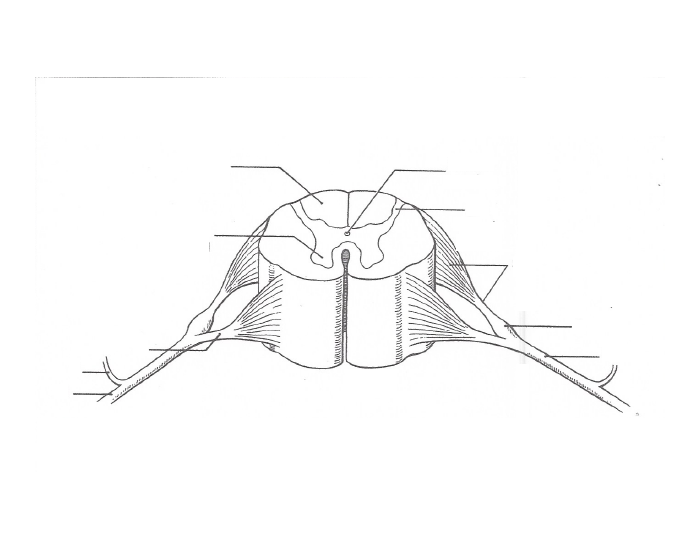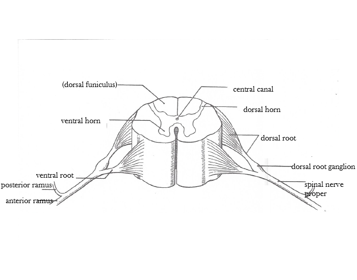 dorsal horn, ventral horn, central canal, ventral and dorsal nerve roots