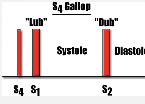 •S4 times with rapid, active filling in late diastole from atrial contraction