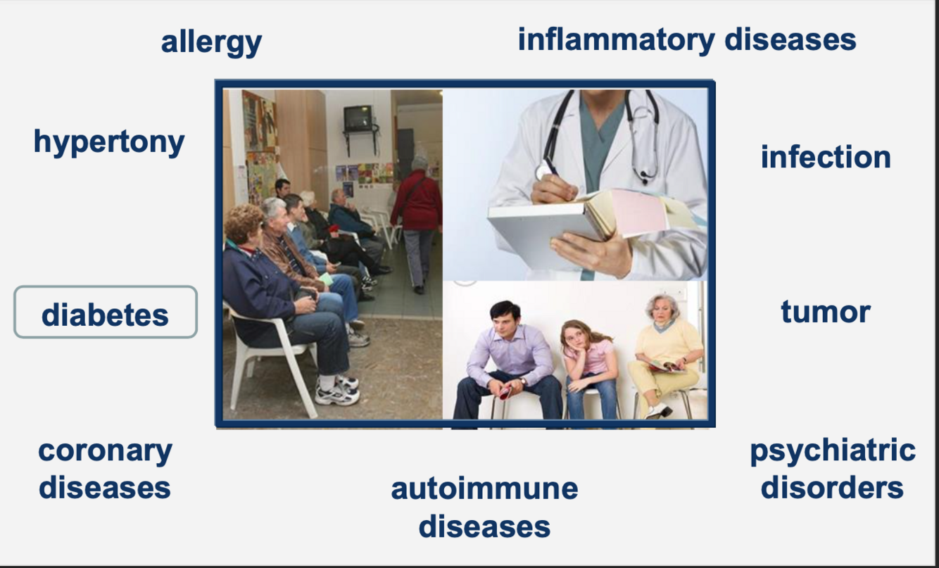 Cancer, Diabetes type II, Hypertension, asthma, atherosclerosis (coronary), rheumatoid arthritis, multiple sclerosis, epilepsy, schizophrenia, Parkinson disease, manic depression