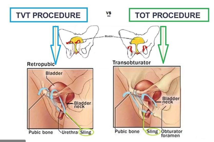 TOT = obturator (more common groin pain) TVT = "retropubic" (more common all other inuries)