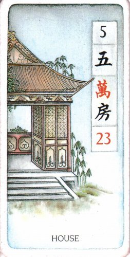The tangible fabric of a building rather than the symbol of an organization or society. This is particularly the case when the House card appears in conjunction with Entering (1 Wan) (the symbol of a door), when it reveals the querent actually entering the building, or Earth (3 Wan), when it shows a building standing in its own grounds.