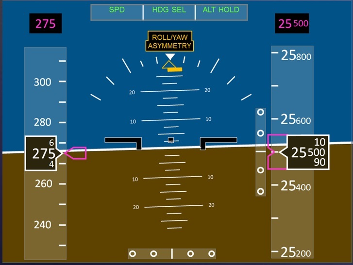 What does an amber ROLL/YAW ASYMMETRY on the PFD indicate?