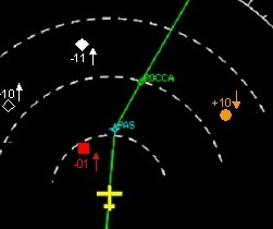 Aural “Traffic, Traffic” with an amber circle at range and relative bearing showing altitude relative to your aircraft and if it’s climbing or descending