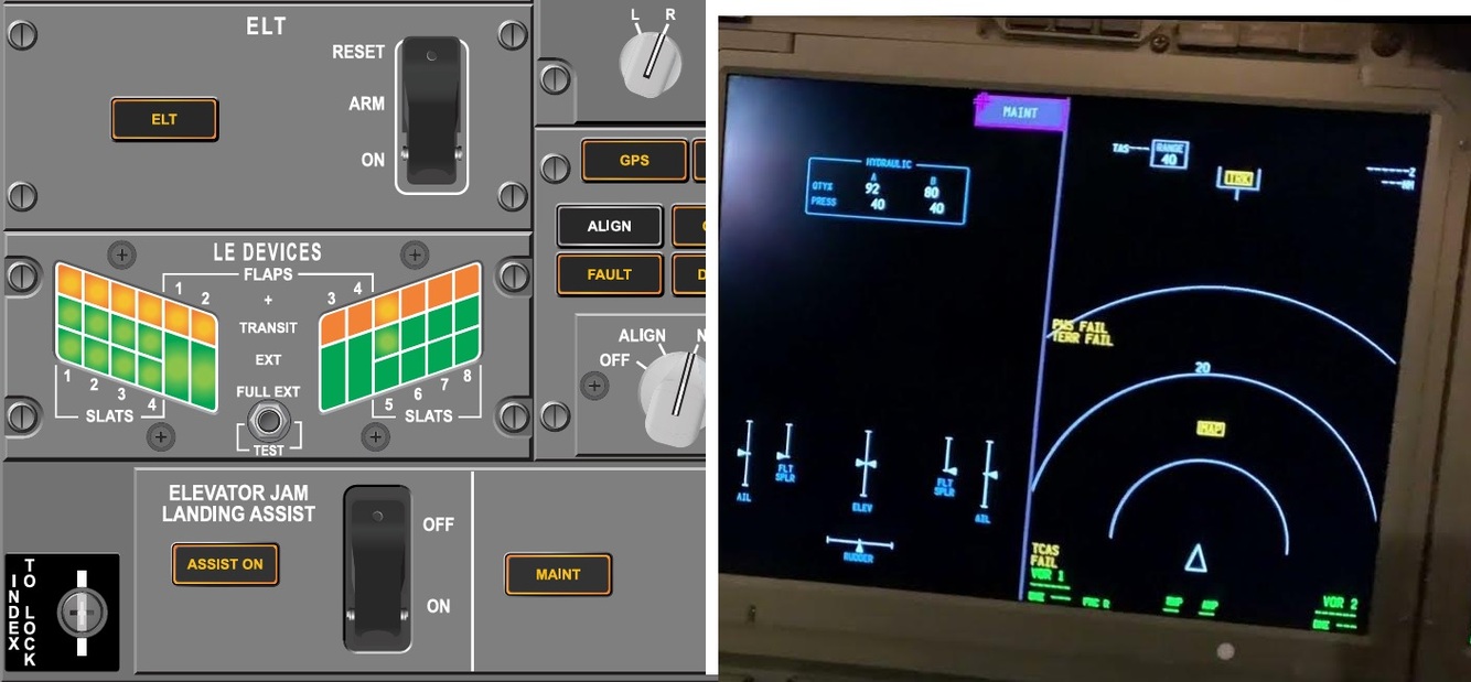 What is the difference between the amber MAINT light on the aft overhead panel and the magenta MAINT box on the MDS SYS page?