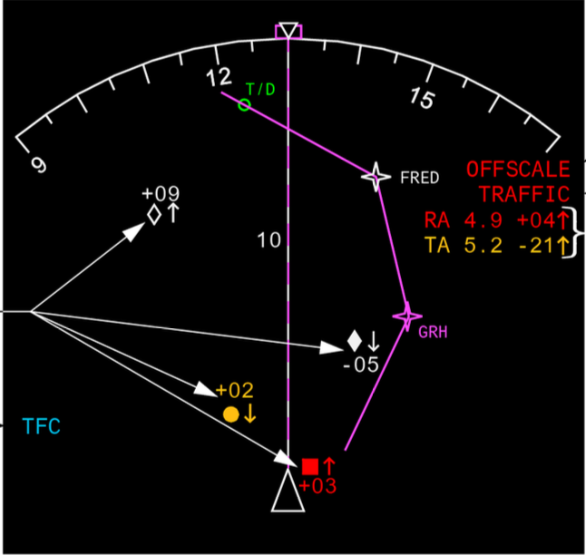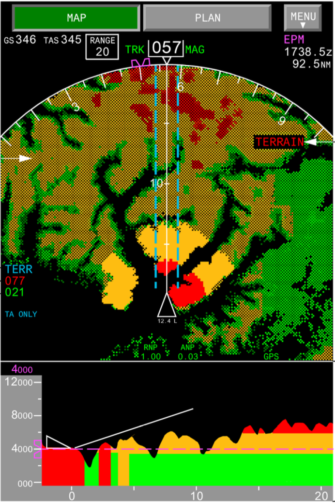 The look ahead terrain warning display is available even if the pilots have not selected TERR on their EFIS control panel.