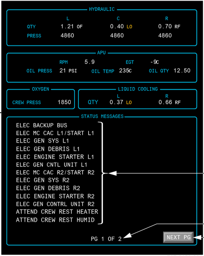 Status Display, when selected from the System Menu, displays hydraulic, APU, oxygen system, cooling liquid indications, and status messages.