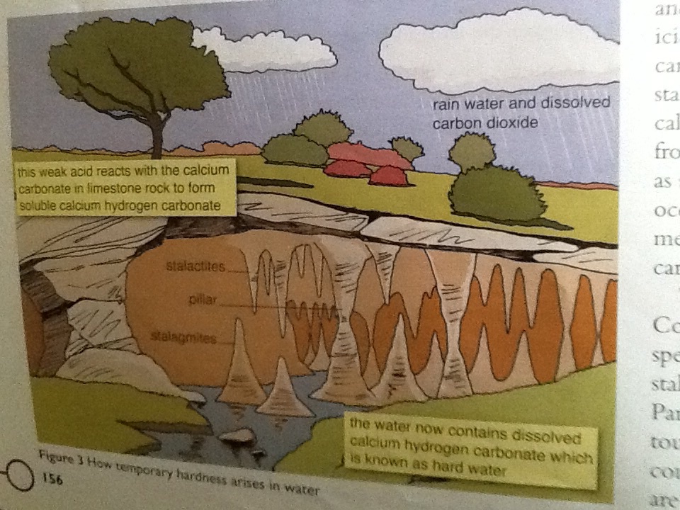 Carbon dioxide dissolves in rain water forming a weak carbonic acid. CO2 + H2O –> H2CO3 Carbonic acid falls on limestone rock and forms soluble calcium hydrogen carbonate. H2CO3 + CaCO3 –> Ca(HCO3)2 Calcium ions are in the water