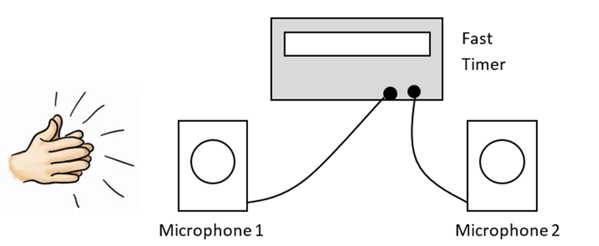 Describe how to measure the speed of sound with two students using a clapper board, stop watch and trundle wheel.