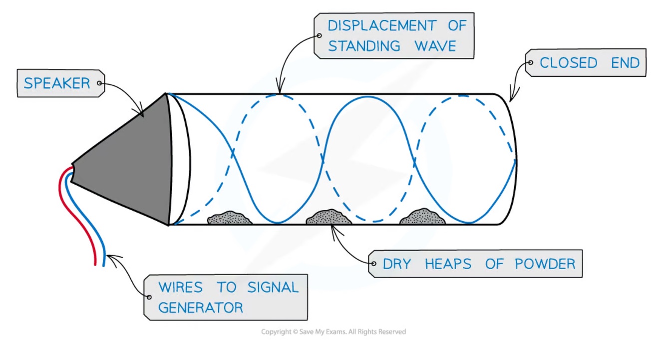 Place fine powder inside an air column and a loud speaker at the open end. At certain frequencies, the powder should for evenly spaced heaps at points of no disturbance