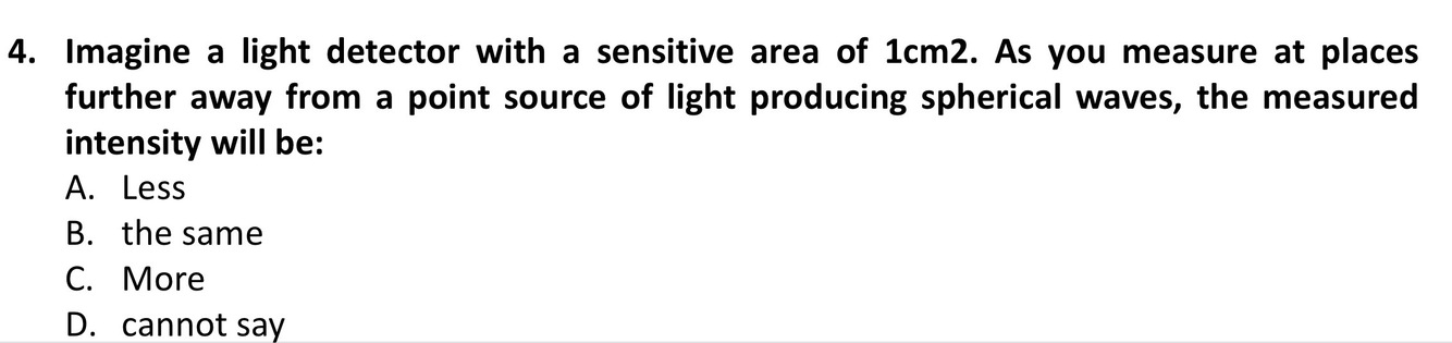 I = intensity in W/m²P = power in Watts (W)A = area in metres squared