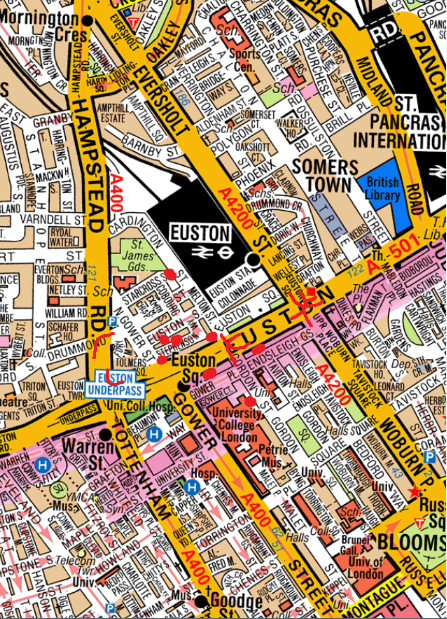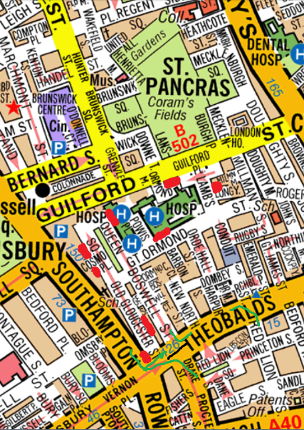 Guilford st Two Way Area Queens Square Arrival Details: From Grays Inn Rd Past Guilford Place SDOL Departure Details: West FAR Grenville St FAL Russell Square East FAL Grays Inn rd FAR Guilford place
