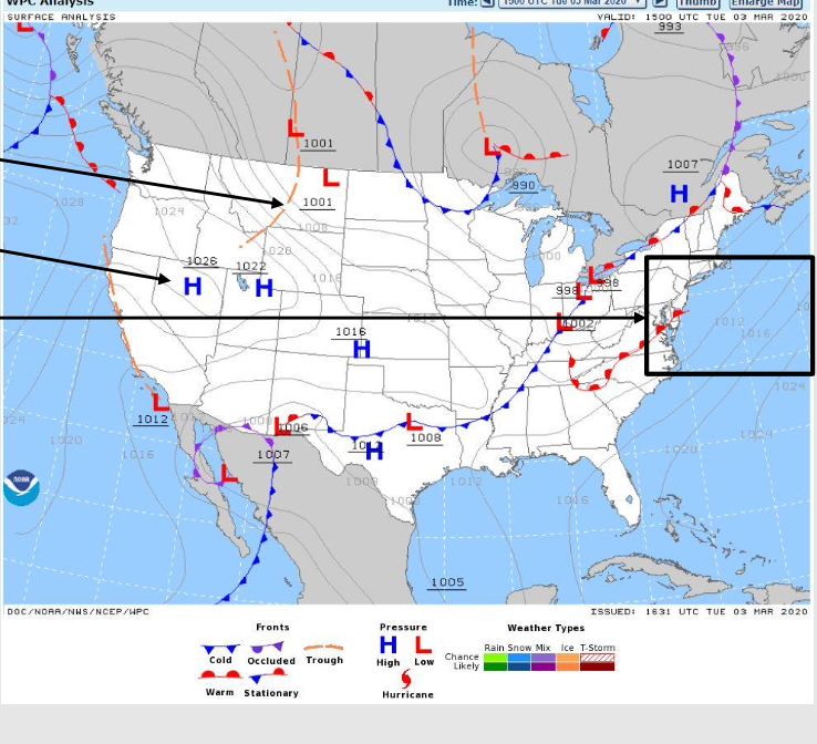 Display trough, pressure centers, isobars (4 millibar spacing)
