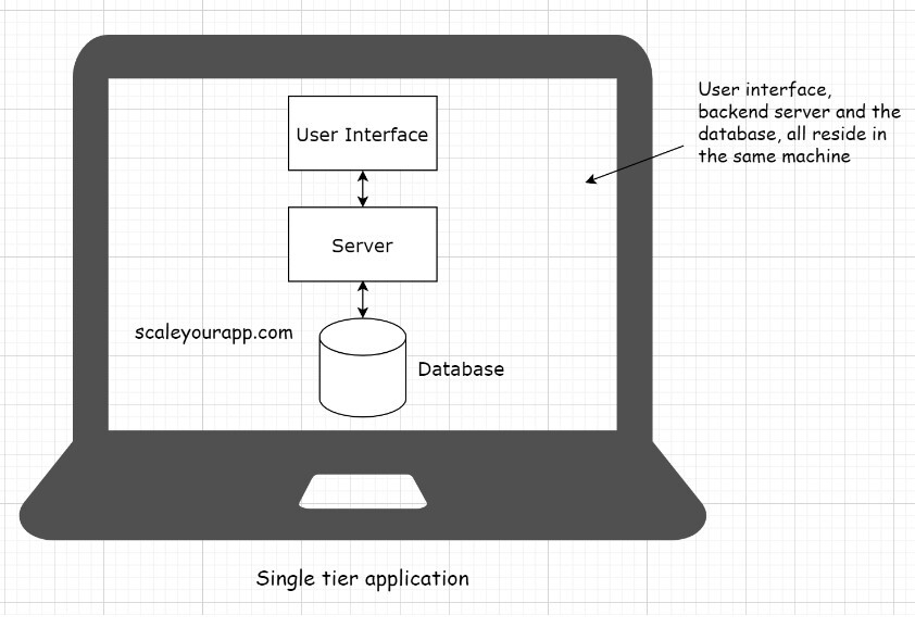 In a single-tier application, the user interface, backend business logic, and the database reside in the same machine.