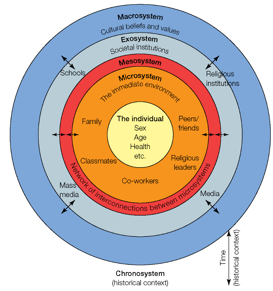 Exosystem - social institutions that impact development (e.g. schools, media, religious institutions)