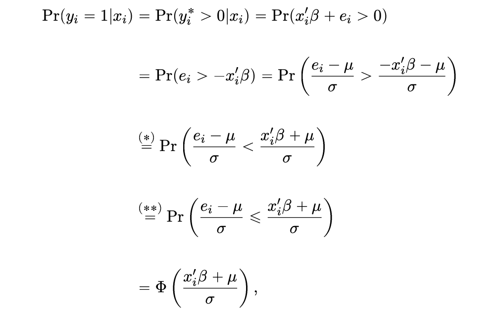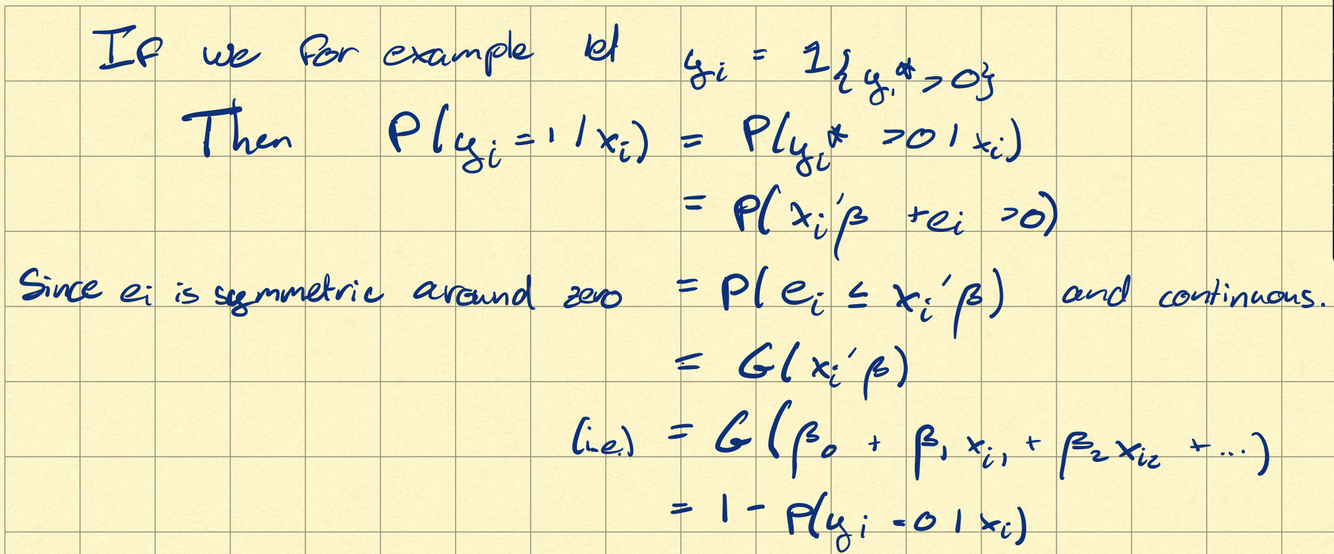 Derive the probabilities for P(yi = 1 | xi) in a binary probiy/logit model for the case that yi = 1{yi* > 0}.