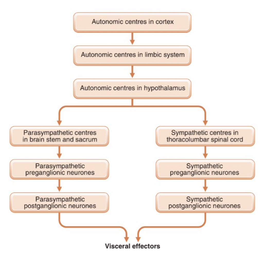 Nerves send impulses down the hypothalamus, and through the sympathetic and parasympathetic nervous system nerve centers.