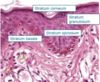 slightly flattened cells, shrunken nuclei with intracellular keratohyaline granules containing profilaggrin (biologic glue), loricrin